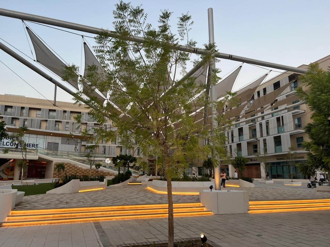 استمتع بالسكينة في ساحة إيكو بلازا الحديثة، واستمتع بصوت النافورة الهادئ وأماكن الجلوس المظللة والنباتات الخضراء الغنية. تقدم هذه الواحة الجميلة مكانًا هادئًا في قلب المدينة.